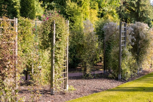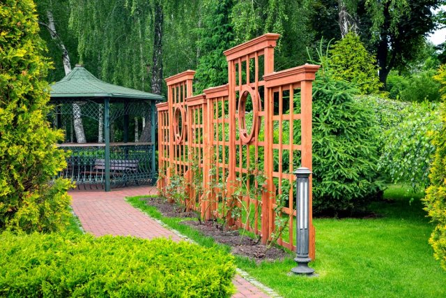 Пергола-ширма, или шпалера, чаще всего используется для зонирования сада, также она поможет задекорировать неприглядный угол участка или укрыть посадки от сильных порывов ветра. Такой перголой удобно отделять парадную зону от хозяйственной, а можно укрыться за ней от посторонних взглядов, поставив на границе участка.