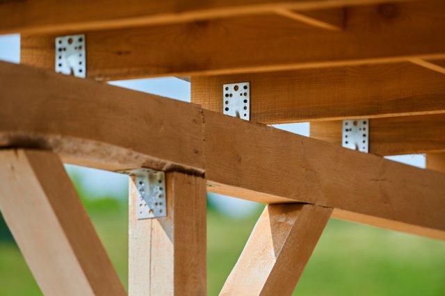 После установки и выравнивания по уровню столбов к ним саморезами или болтами крепят горизонтальные несущие балки (сечение 10-15х5 см). Если в беседке четыре опоры, балками делают так называемую обвязку по верхнему венцу. Если опор шесть, их соединяют балками попарно. В том и другом случае конструкцию усиливают подкосами, которые обеспечивают дополнительную стяжку.