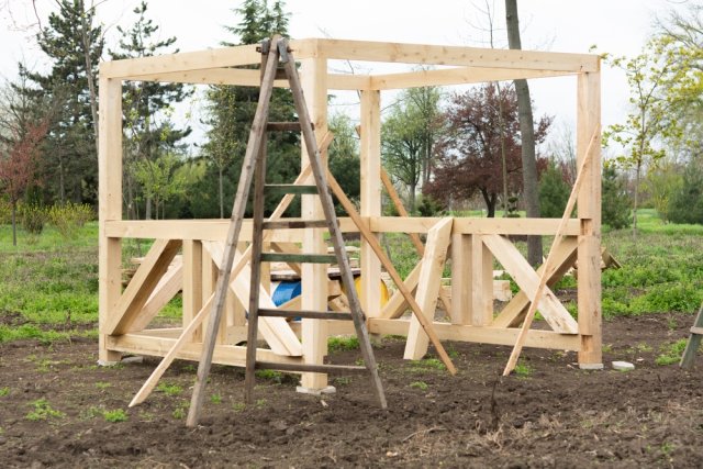 Для их изготовления мы предлагаем использовать дерево – как самый простой в обработке и не требующий профессионального оборудования материал. Обычно применяют древесину, которая есть в доступе, – чаще всего это сосна, иногда акация, дуб или лиственница. Удобнее и правильнее всего строить из струганого или клееного бруса и доски камерной сушки, материал естественной влажности использовать не стоит, т.к. он деформируется в процессе высыхания.