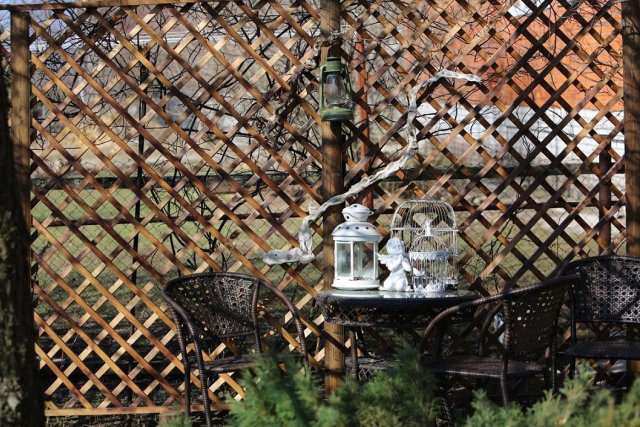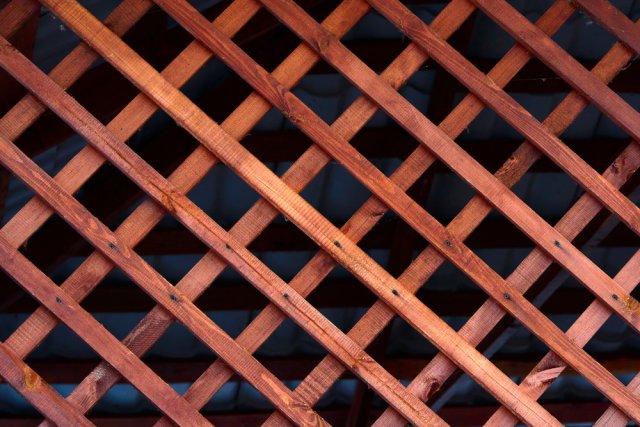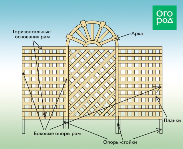Пергола-ширма представляет собой прямоугольную раму с рейками внутри, расположенными крест-накрест так, чтобы получились квадратные или ромбовидные ячейки. Размер стороны ячейки может составлять 10-20 см – в зависимости от задумки автора и требуемой жесткости конструкции.