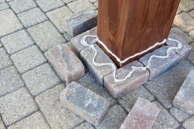 Первый и очень важный этап создания перголы – фундамент для опорных стоек. Брусья из прочной древесины (дуба, лиственницы) можно просто вкопать в землю на четверть высоты. Мягкую древесину следует сначала обработать пропиткой и гидроизолирующим составом, а затем вкопать либо установить в ямы и залить бетонной смесью.