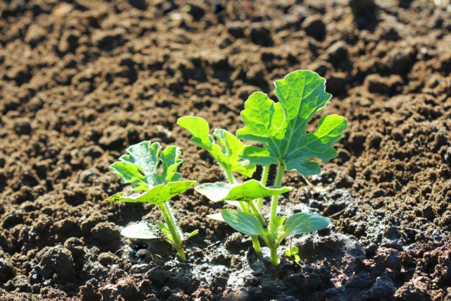 Высаживайте арбузы, оставляя расстояние между ними около 70 см, а ширину междурядий сделайте минимум 1 м. Почва должна быть плодородной, влагопроницаемой, с нейтральной кислотностью. Корни арбузов уходят вглубь на 40-50 см – именно такой толщины должен быть рыхлый плодородный слой. При посадке каждую лунку можно заправить комплексным минеральным удобрением (например, азофоской) из расчета 15 г на растение.
