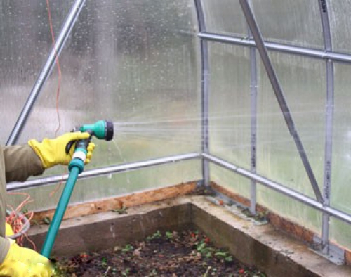 Из теплицы убирают старые колышки, бечевки для подвязки, растительные остатки — весь мусор, который не собрали осенью. После этого стены и потолок моют простой водой с обеих сторон — внутри и снаружи. Сильно загрязненные места промывают мыльным раствором. Следите за тем, чтобы мыло не попало в землю.