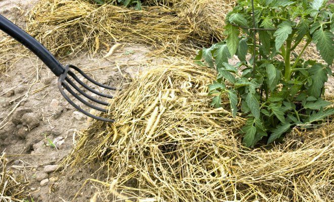 Этот способ больше подходит для сада, но применять его можно и на огородных грядках. Так как мульча имеет крупные частицы, она пригодна только для сильнорослых культур. Использовать можно как солому, так и сполотые сорняки.