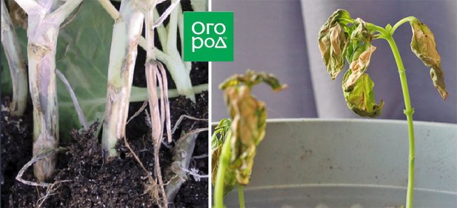 Листья бледнеют, желтеют, покрываются углубленными красноватыми пятнами и засыхают, корневая шейка начинает загнивать. Возбудитель болезни, патогенный грибок, сохраняется в почве и на семенах, активно развивается при высокой влажности почвы и устойчив ко многим химикатам.