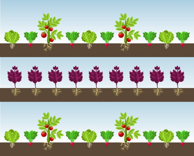 Некоторые из этих культур можно высаживать и вместе с рассадой основных культур. В частности, салатом, редисом и базиликом можно уплотнить посадку томатов (как показано на схеме). Пока молодые помидоры будут набираться сил, зелень с редисом успеют созреть.
