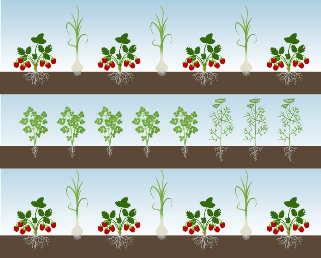 А вот грядки с клубникой неплохо «разбавить» чесноком и петрушкой, которые не только не мешают ее развитию, но и спасают от улиток, слизней и других вредителей. Чеснок можно посадить между кустиками садовой земляники (как показано на схеме), а петрушку и другую зелень – в междурядьях.