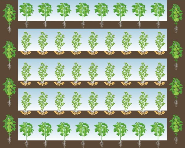 Фасоль и бобы можно высадить по периметру картофельных рядков, как показано на схеме. Бобы лучше высаживать на концах борозд «второго хлеба», чтобы не повредить их во время окучивания культуры.
