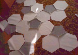 Соединяя детали в единое полотно, следуйте заданному расположению частей: на один шестиугольник приходится по три пятиугольника, которые пришиваются через грань.