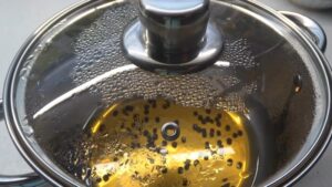 В кастрюлю выливаем 200 мл воды, добавляем чайную ложку черного перца (горошек). Он содержит антиоксиданты, витамин C, кератин, улучшает кровообращение.