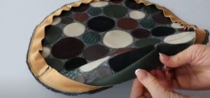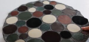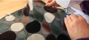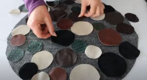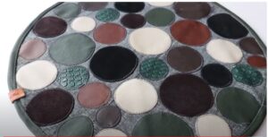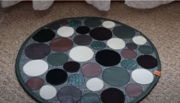 Кусочкам кожи можно найти применение при создании коврика. Для этого из них вырезаются любые фигуры — круги, квадраты, треугольники, полоски… Всё это укладывается на основу и пришивается.