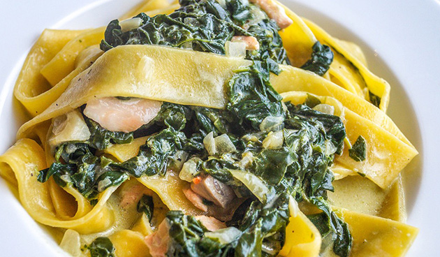 Добавление шпината обогатит вкус привычных спагетти. Блюдо получается сытным и питательным